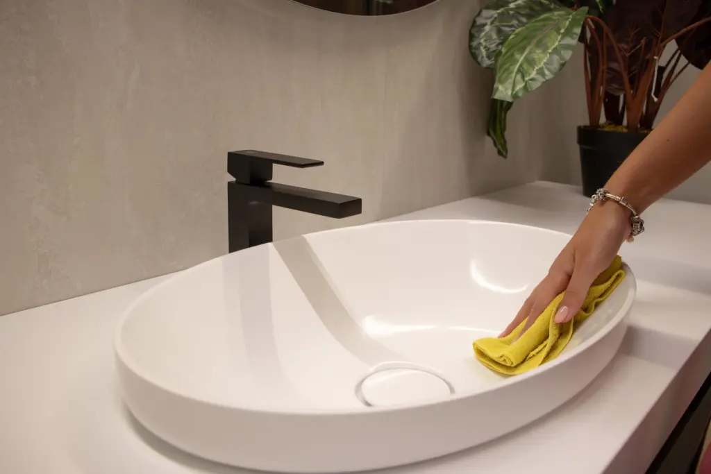 Limestone is no obstacle for Kerrock. You can use vinegar or bathroom cleaner — apply to the surface, leave for 2-3 minutes, wipe with a soft cloth and rinse. The surface will be shiny again.